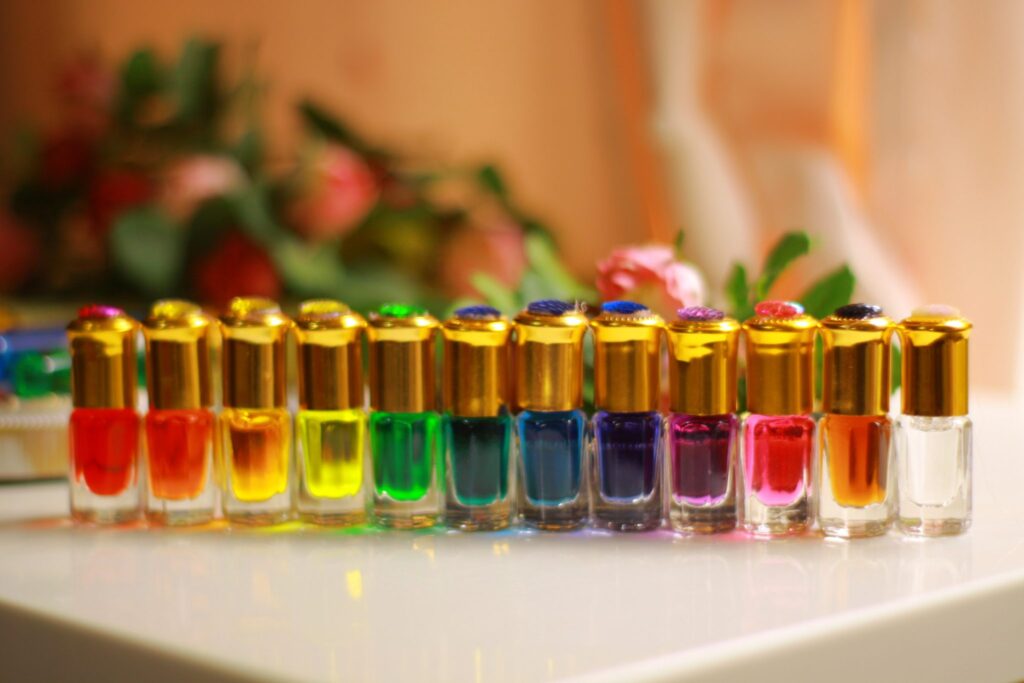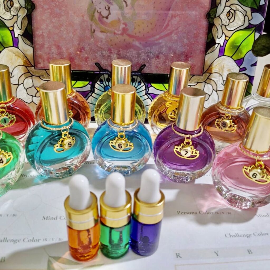 オリジナルのマイチャクラボトル7色を作ります。 22本の心理アロマセラピーより各色の裏心理より7色のバランスをどうとればチャクラバランスがとれるかのメニュー