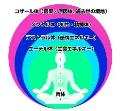 まずは肉体、エーテル体→生きている健康や生命エネルギー層、肉体とも重なって存在するエネルギーボティー、その次にアストラル体→感情、記憶、潜在意識のエネルギー体、怒りなどはここに溜まります。次にメンタル体→よく耳にするメンタル、心の健康状態を表す。精神力があるか、知識を持っているかでメンタルが強い弱いはここの層です。そしてコザール体→人間を超越した神の力も宿すことも言われる。スピリチュアルな概念における人間のエネルギー体4の一つ高次元の魂、自分の魂の目的を理解したり、過去世の影響もあるエネルギー体そのようなエネルギー体の層があると思ってください。